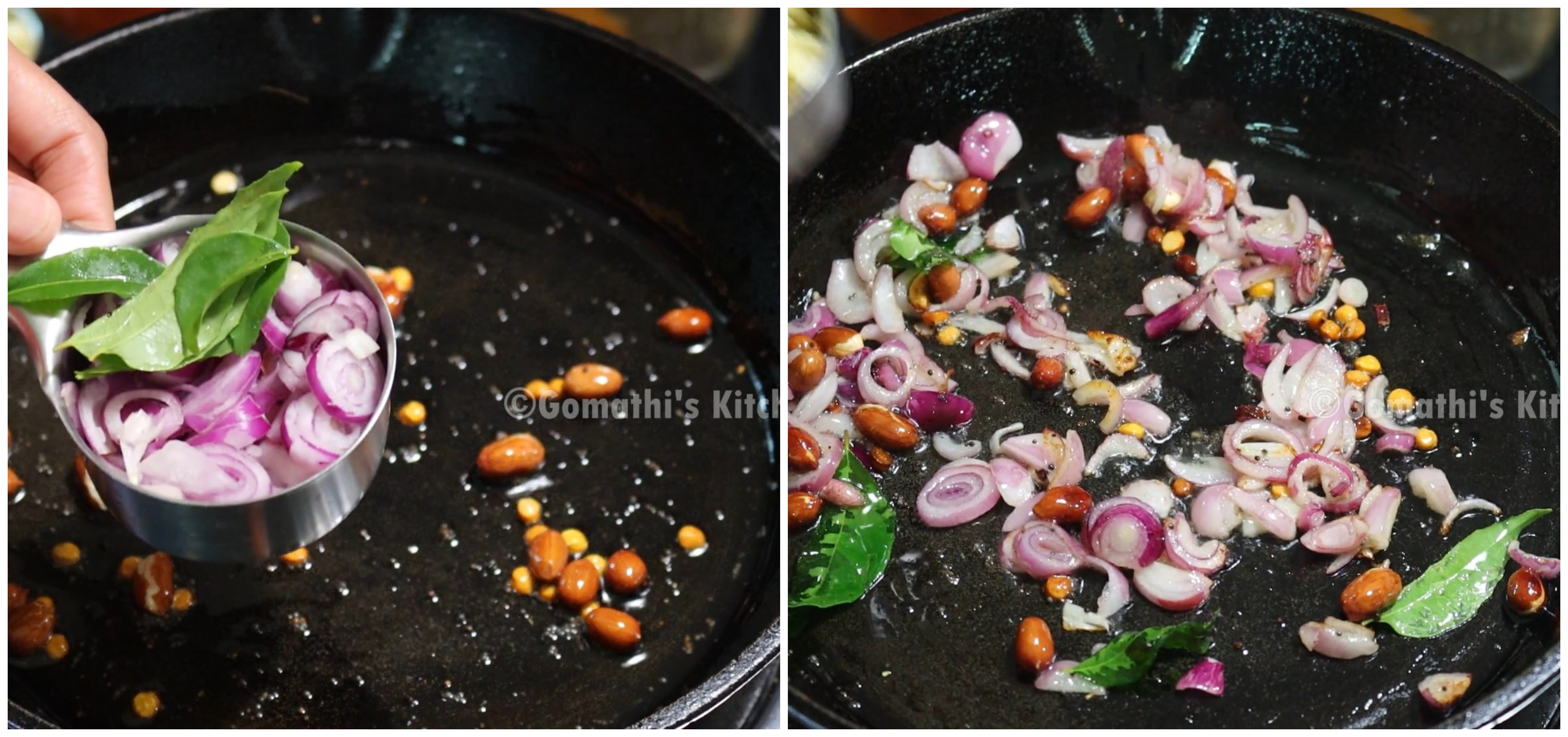 Add chopped small onion and few curry leaves. Sauté till onion become translucent.