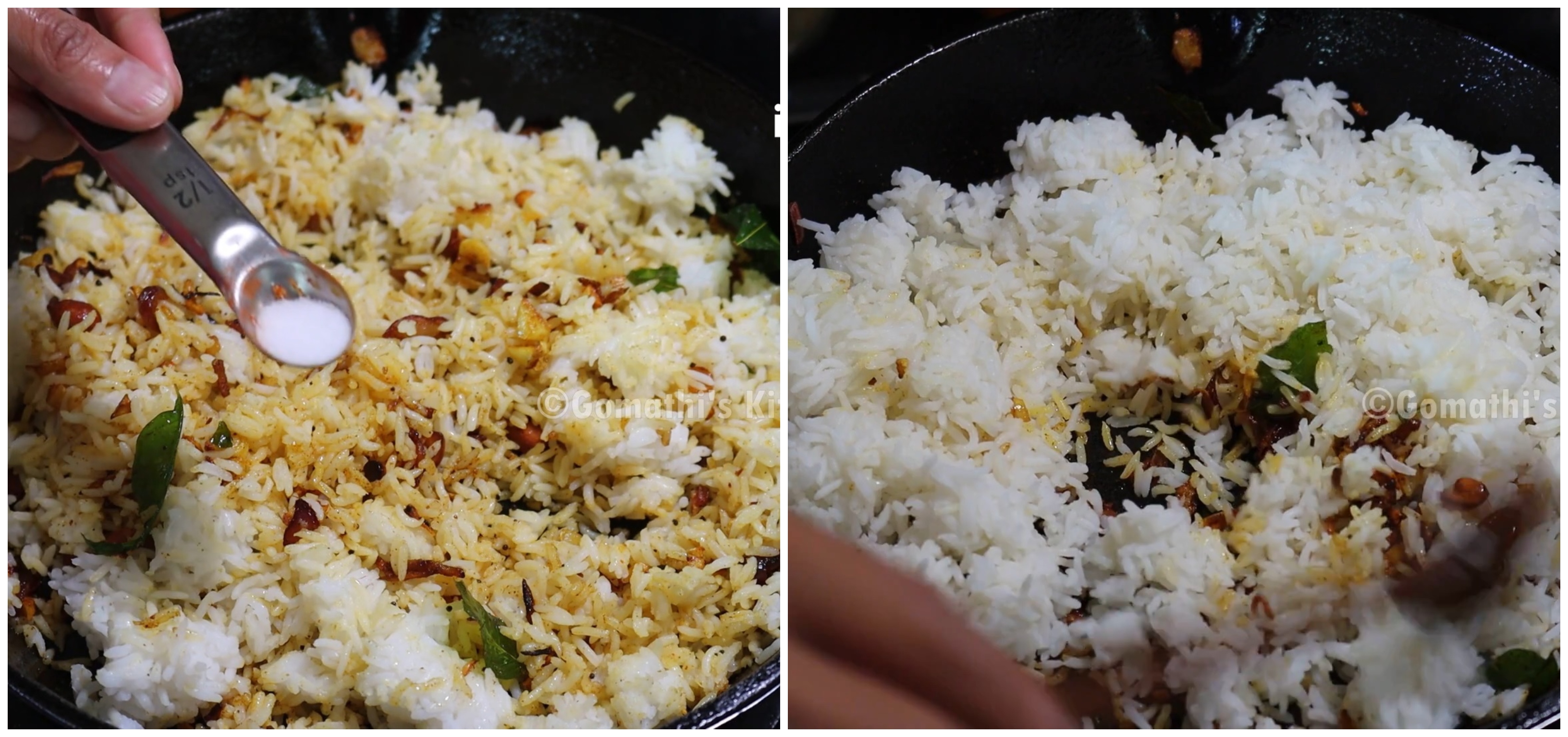 First pressure cooks the rice with required salt and water. (1/2 cup rice with 1 cup water). The rice texture is very important not mushy.
