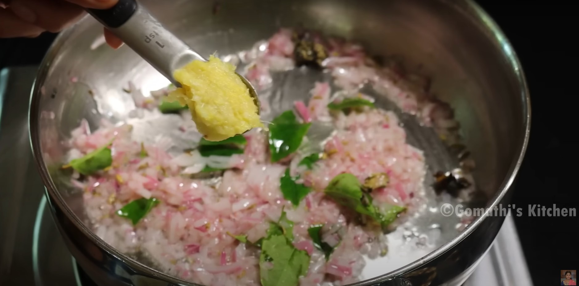 Add chopped big onion and curry leaves and sauté well till onion become transparent.