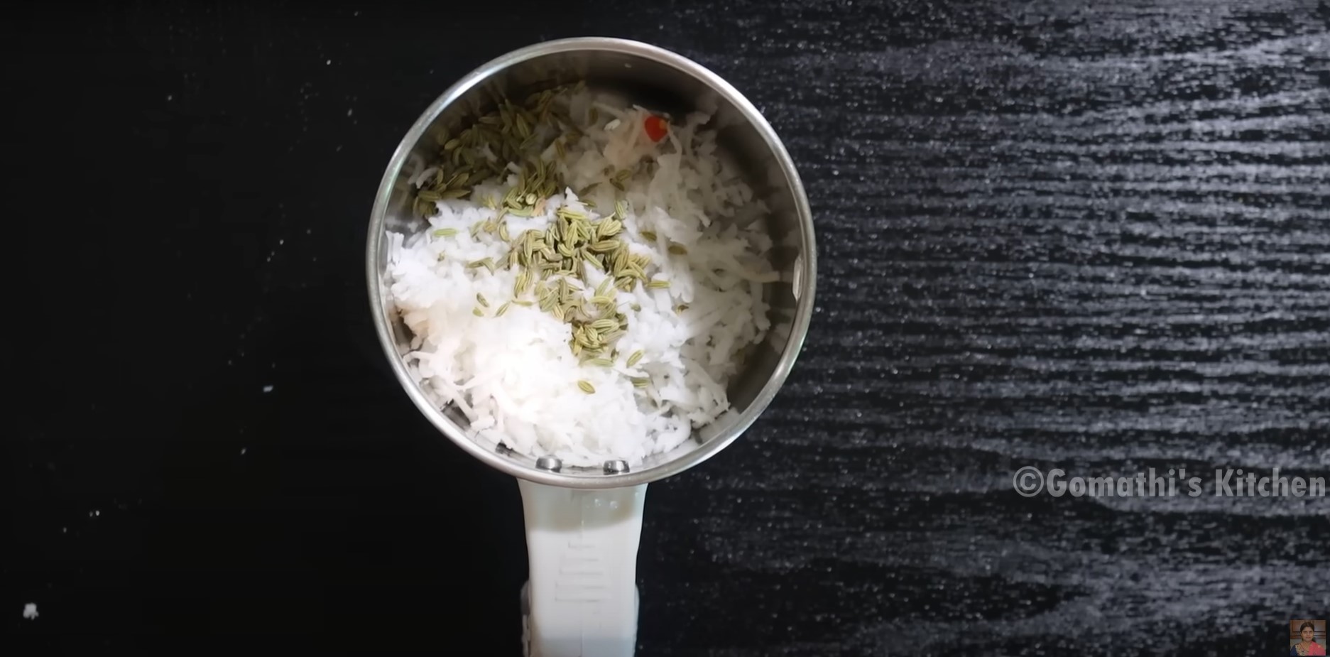 To prepare coconut paste, in a mixie jar add grated coconut and fennel seeds.