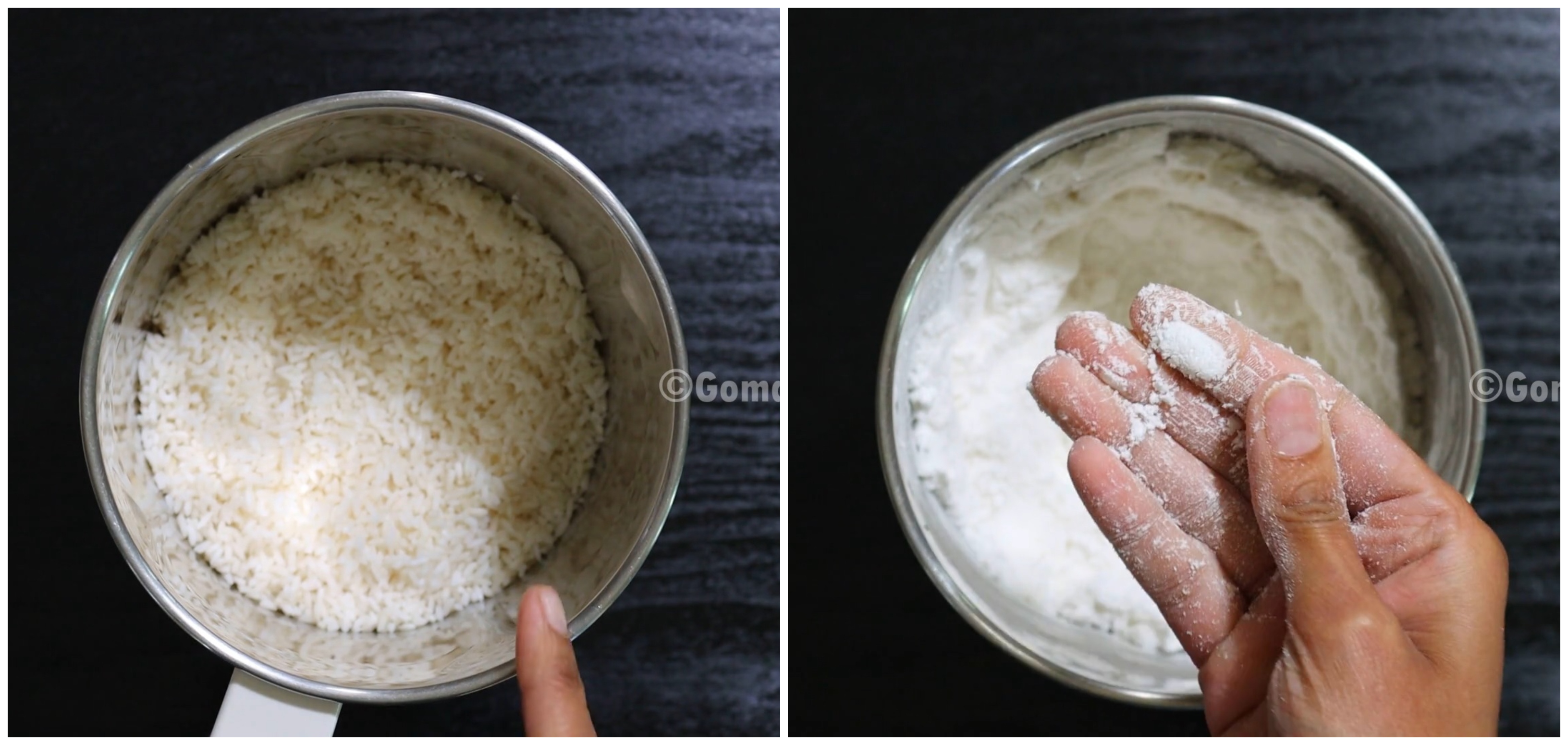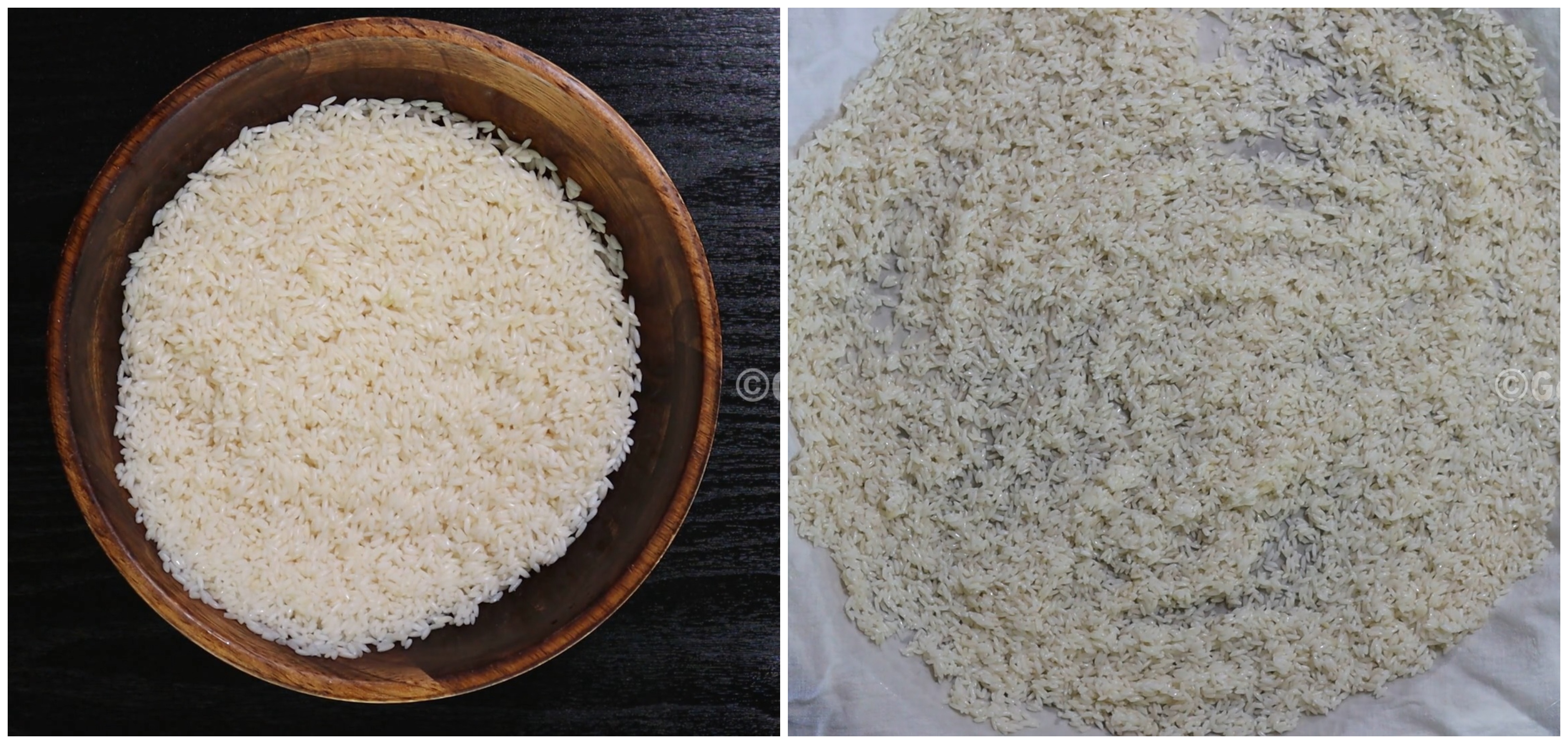 Drain the water completely and spread the rice on the clean cloth allow it to dry say for 1 hr.