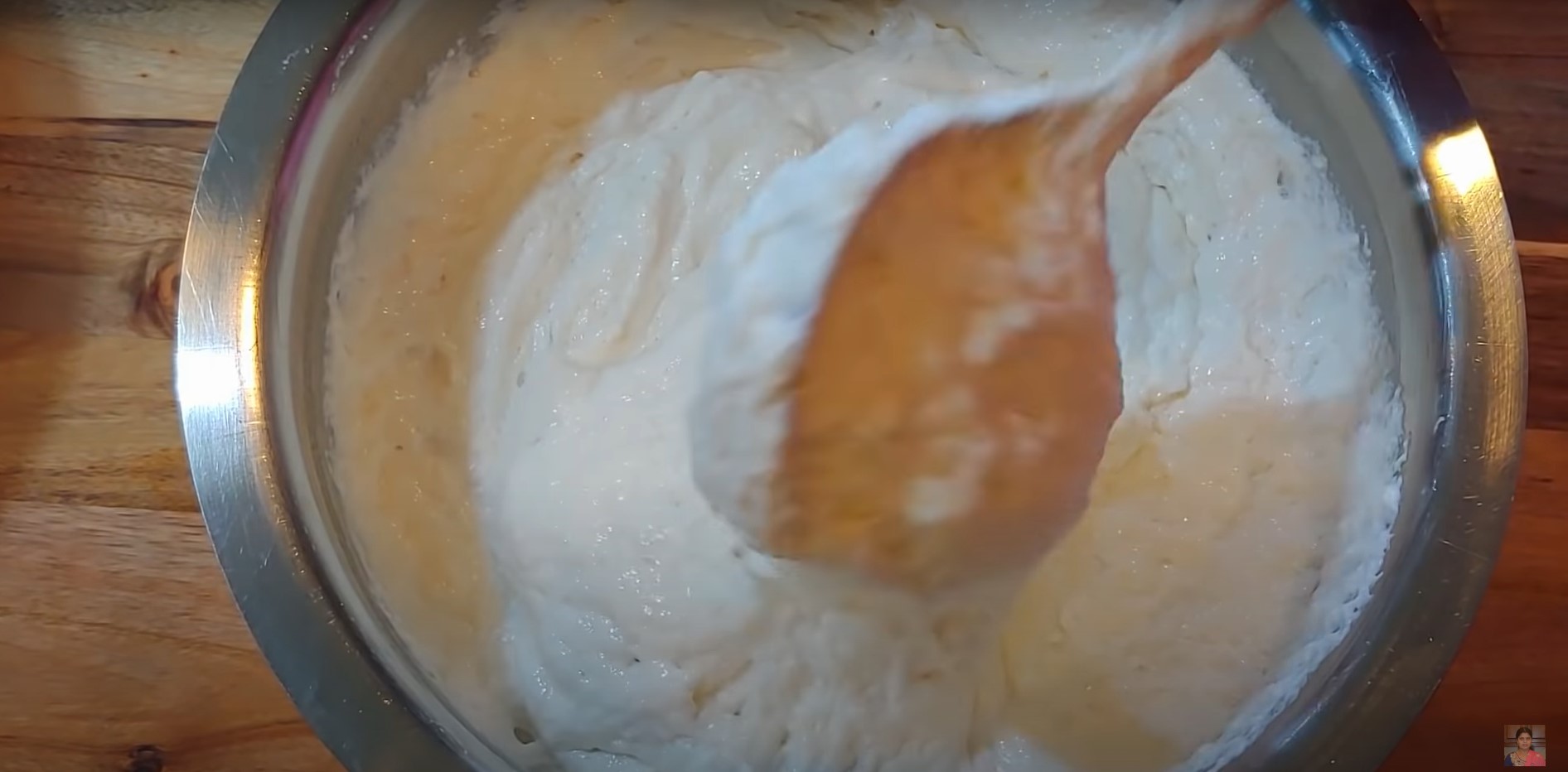 Batter is combined with the help of clean hand. The warmth of the hand will initiate the fermentation process.