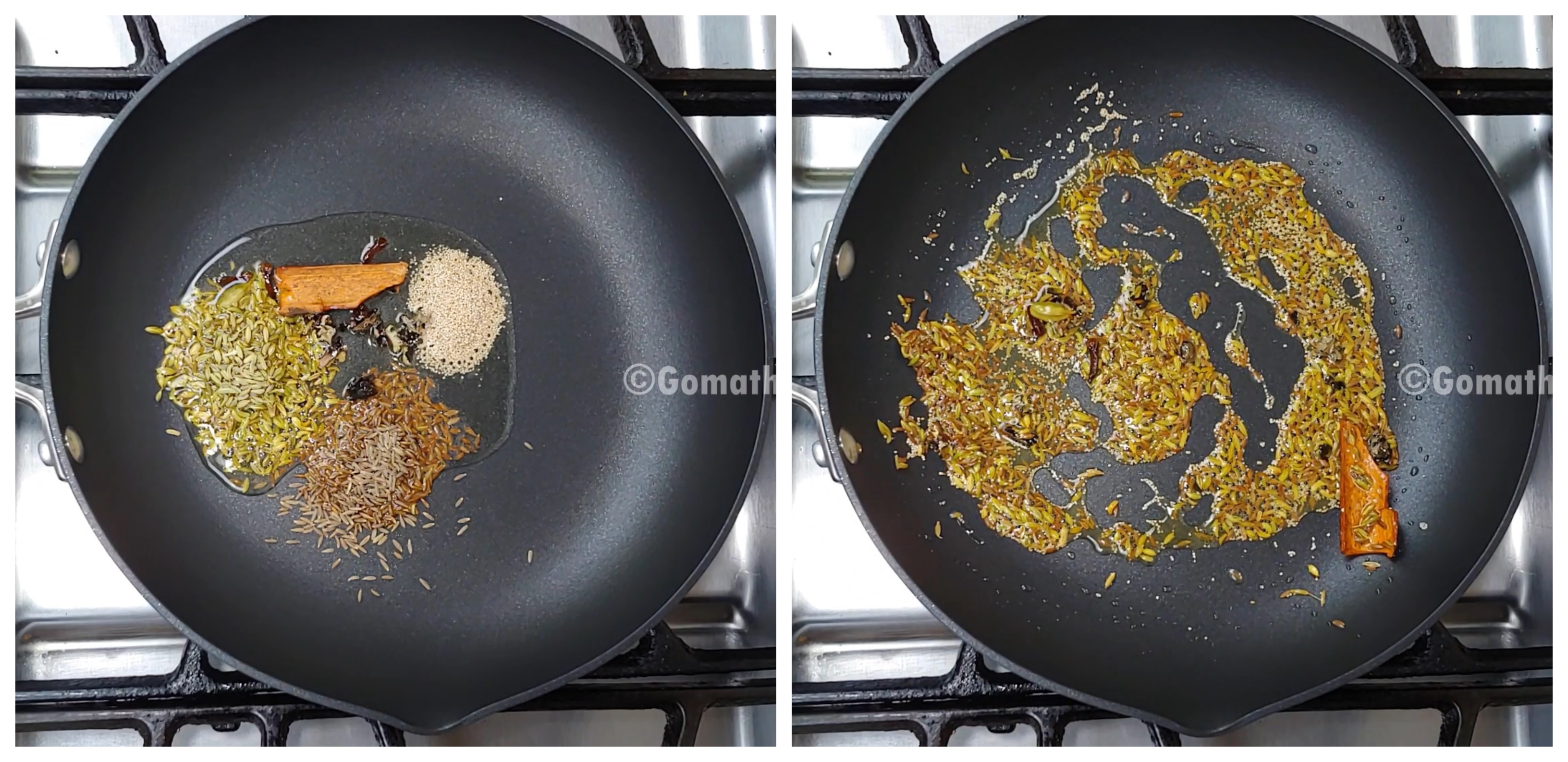 Add Whole spices cinnamon , cloves, cardamom , black stone flower , fennel seeds , cumin seeds , poppy seeds. Roast it in medium flame until turns light golden color.