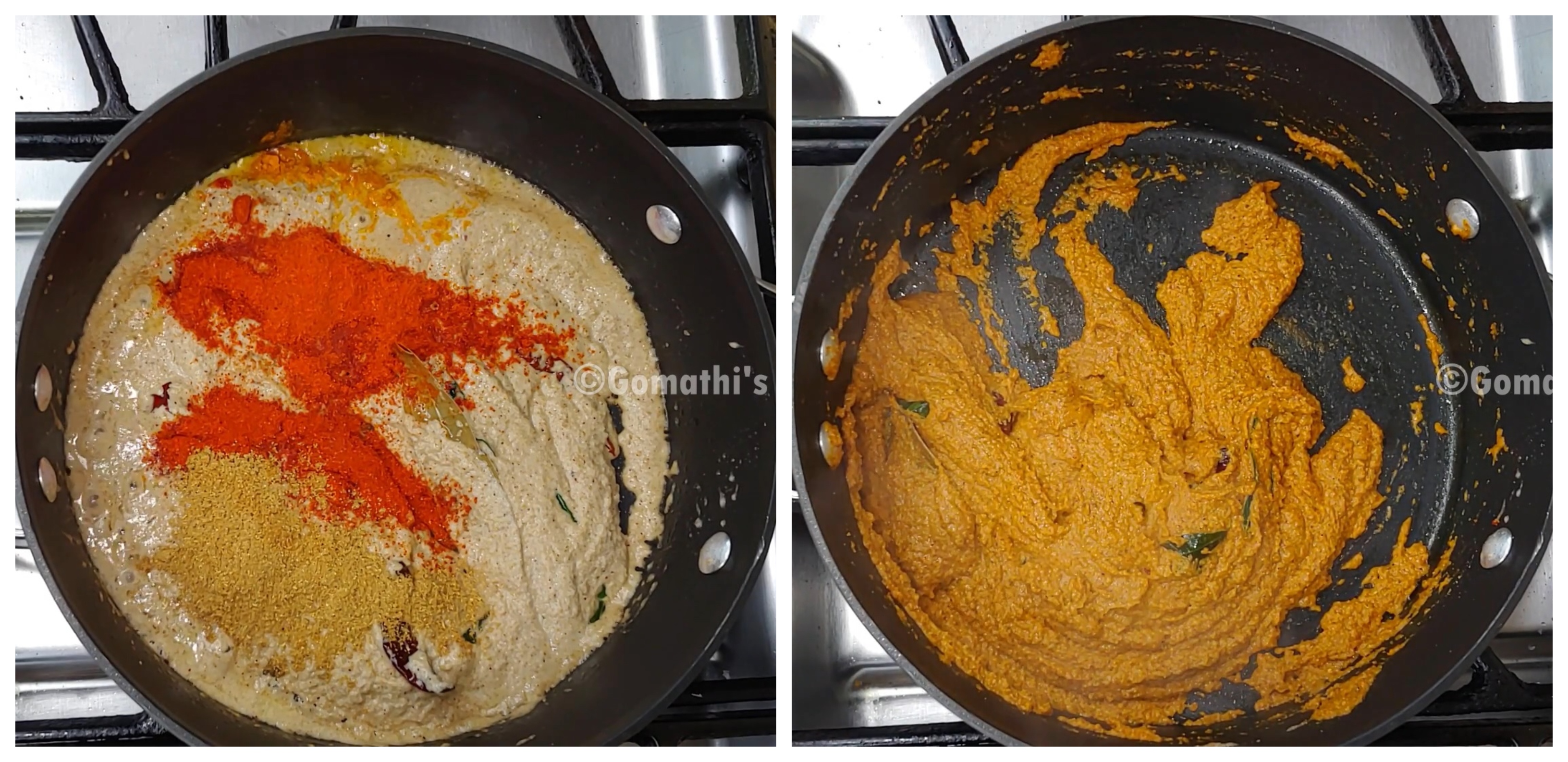 Add fresh masala paste , Then add turmeric powder , Kashmiri red chili powder , red chili powder , coriander powder , Sauté in medium flame until masalas cook well also ooze out the oil .