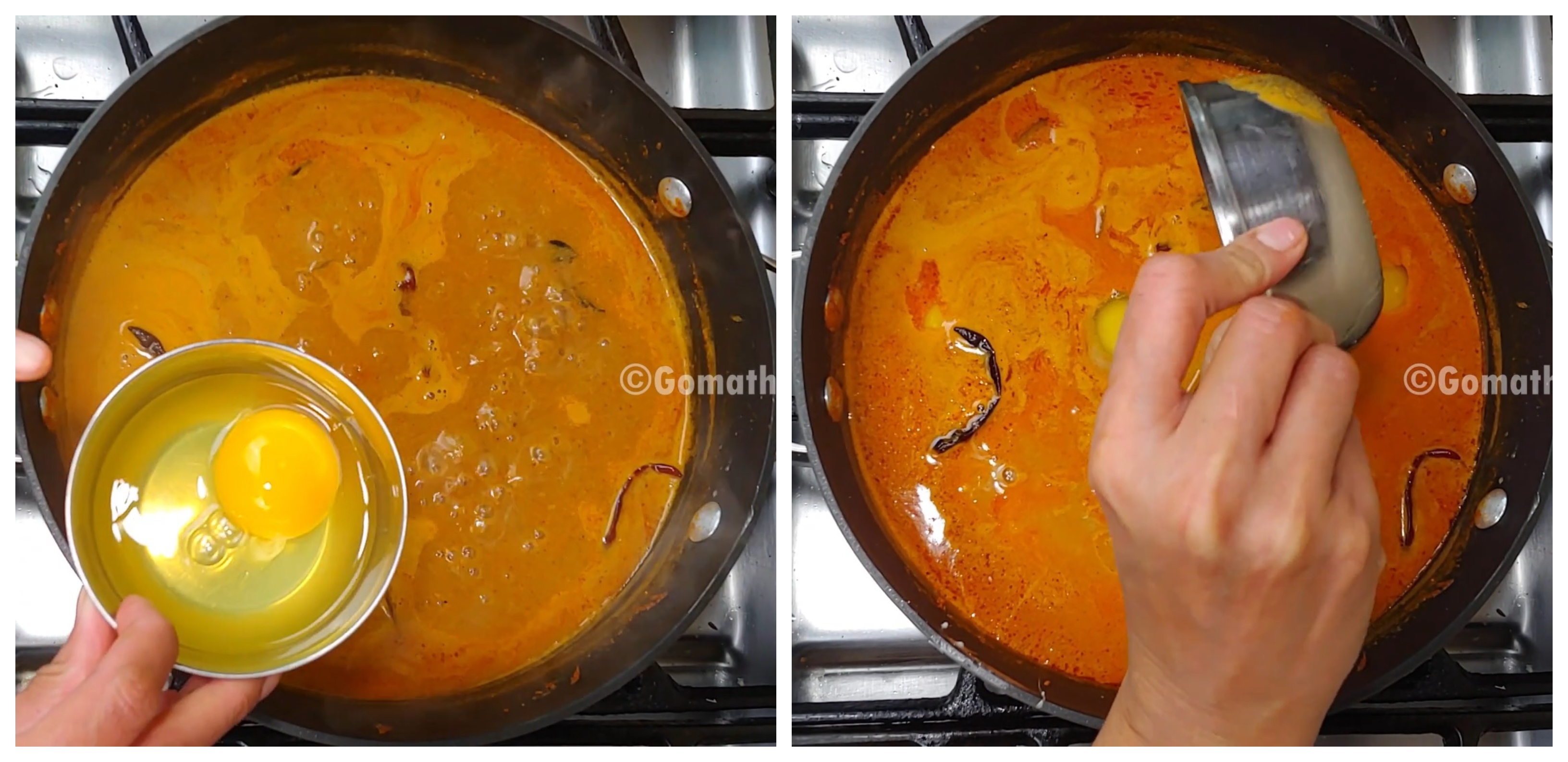 Now break the eggs in a bowl and then add the egg in the bowl to the curry. I find that the eggs hold its shape better if poured from a bowl rather than breaking the eggs directly into the curry.